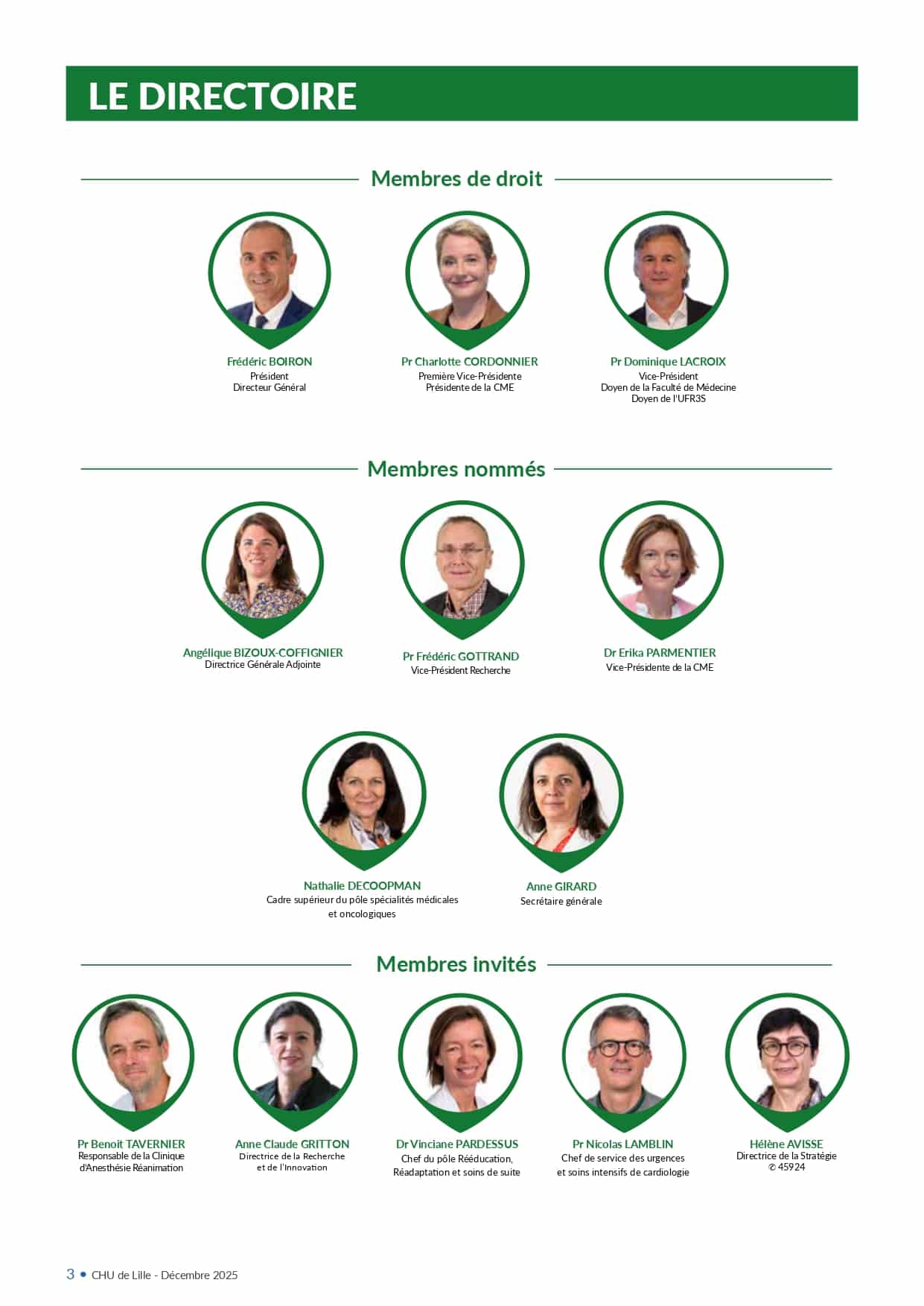 Le CHU de Lille est dirigé par Frédéric Boiron, son Directeur Général. Le Directeur Général conduit la politique de l’établissement, il est également son représentant légal. Il est assisté dans ses missions par une équipe de direction.